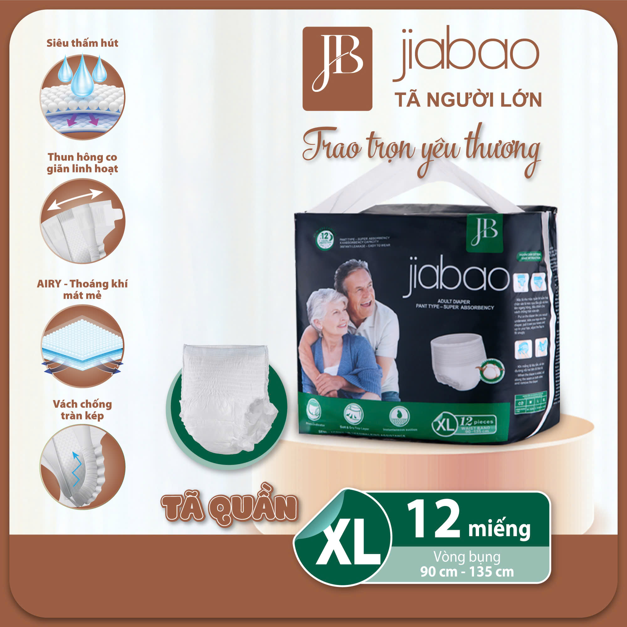 - Tên sản phẩm: Tã Quần Người Lớn Jiabao Công Nghệ Nhật Bản – Bịch 12 Miếng Size XL